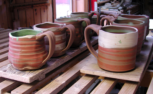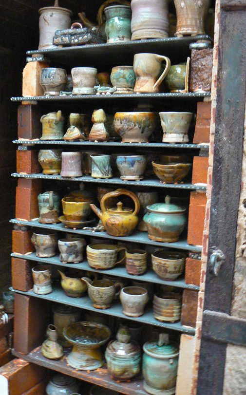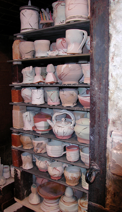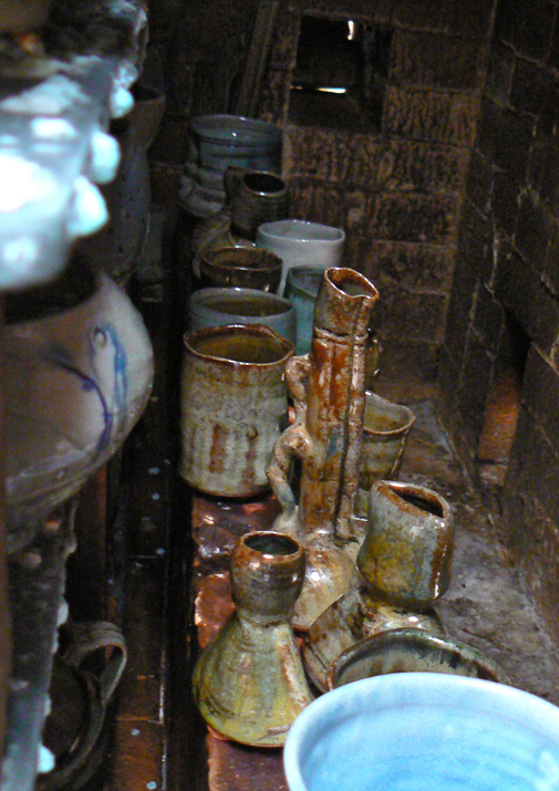 (the front of the stack of glazed ware waiting to be soda/salt fired)