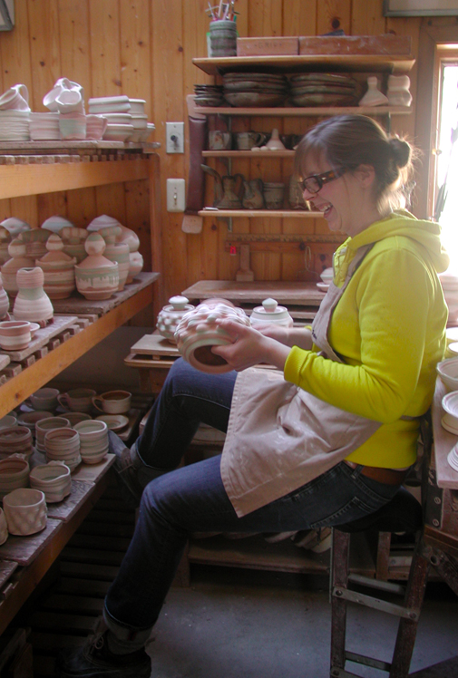 (bone dry pots: plates, an altered jar, and some constructed vases wait to be bisque fired)