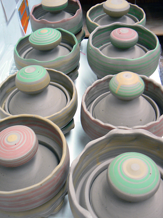 One view of my studio set up at the Armory Art Center… with my wheel elevated to throw standing up and knobs and rims of a new jar series on the table.