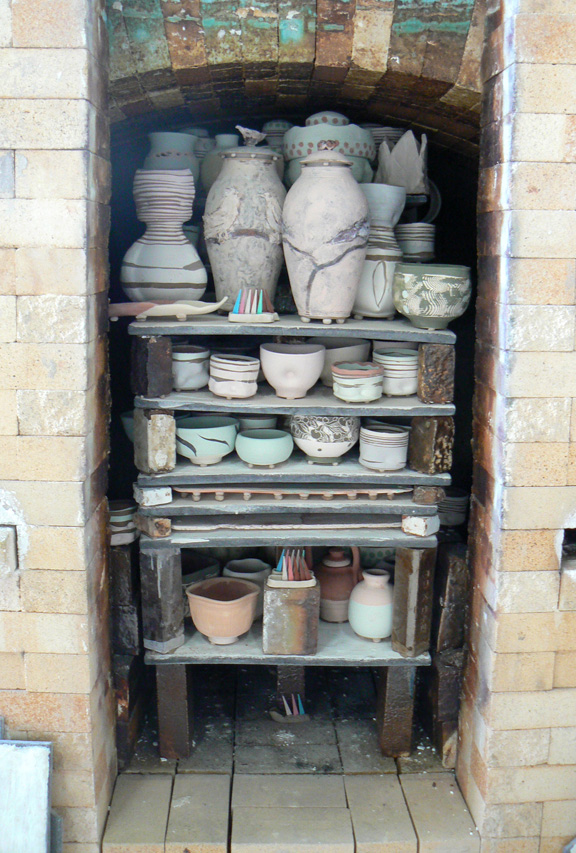 Last week (September 23rd) we loaded the soda kiln at the Armory Art Center full of student work, resident artist work, and some tests. It was my first time firing the soda kiln here and I was pretty amazed with how many pots it gobbled up, having started off thinking that we might not have enough to fill it. ha!