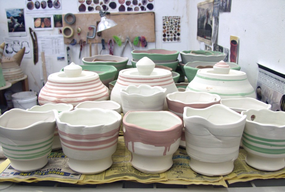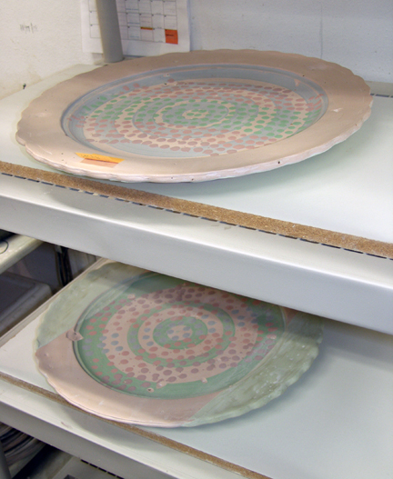 Two 20″ plates in the process of being glazed for soda firing…